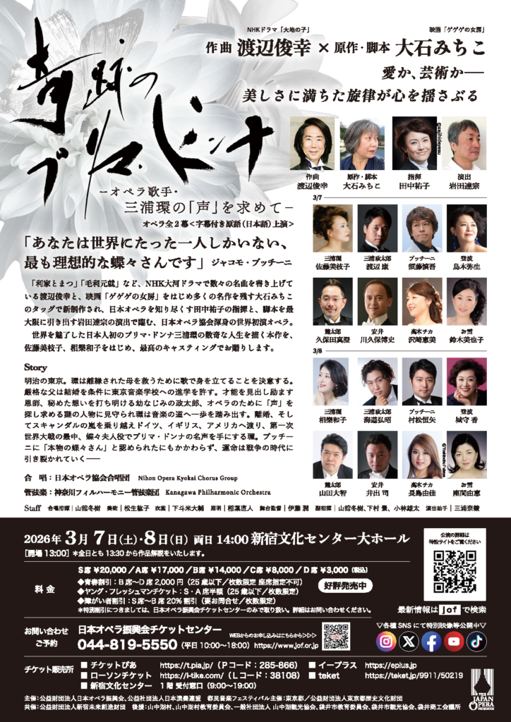 本作は、オペラ歌手・三浦環の軌跡を軸に「愛」と「芸術」の狭間を描く、オペラ全2幕(字幕付き原語〈日本語〉上演)です。